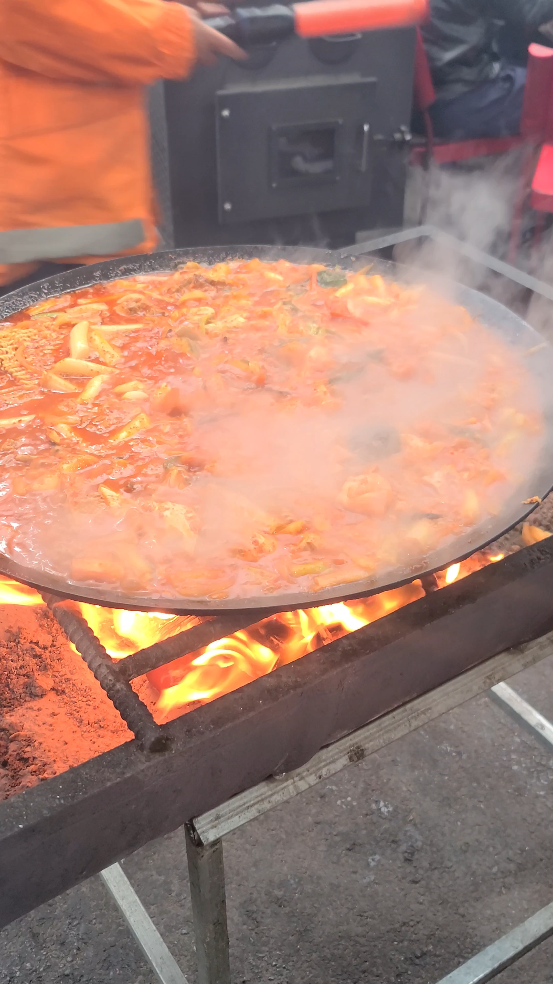 솥뚜껑에 부글부글 끓는 빨간 국물, 넉넉한 양의 닭고기, 감자, 고구마, 당면까지!