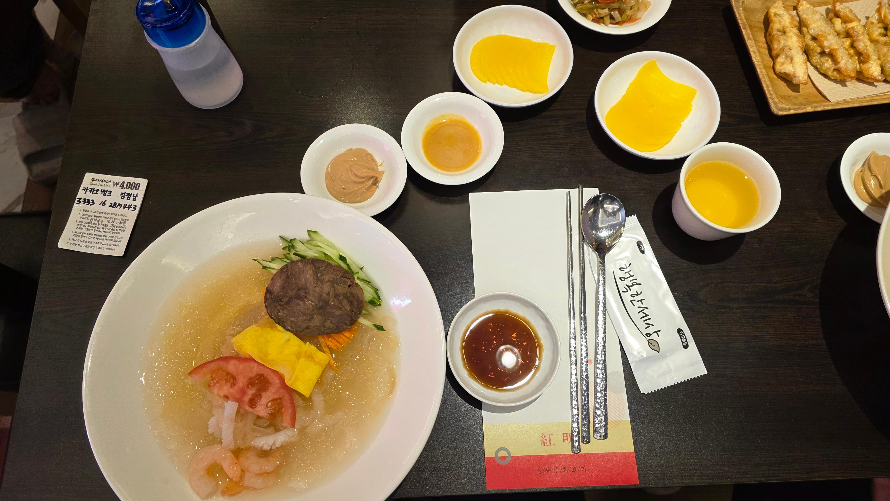 냉면은 일반적인 한국식과는 완전히 달랐습니다. 육수의 깊이, 면발의 쫄깃함, 그리고 고명들의 조화가 절묘하게 어우러져, 말 그대로 ‘깔끔하고 정갈한 맛’ 그 자체였습니다. 살짝 매콤한 맛이 더해져 여름철 입맛 없을 때 딱이었죠.