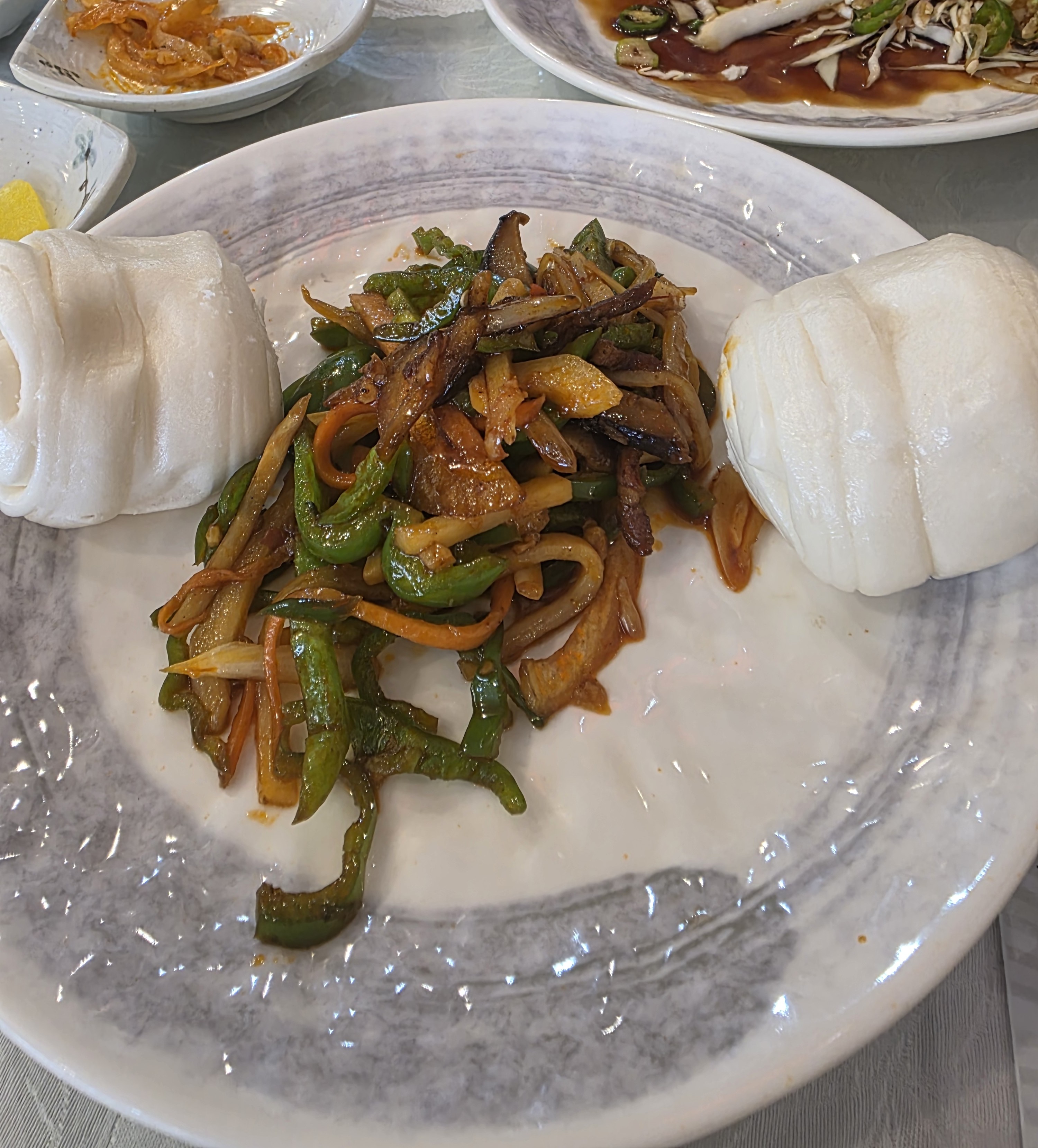 고추잡채의 부드러운 고기와 아삭한 채소가 조화를 이루며, 쫀득한 꽃빵에 싸 먹는 재미까지 더해졌습니다.