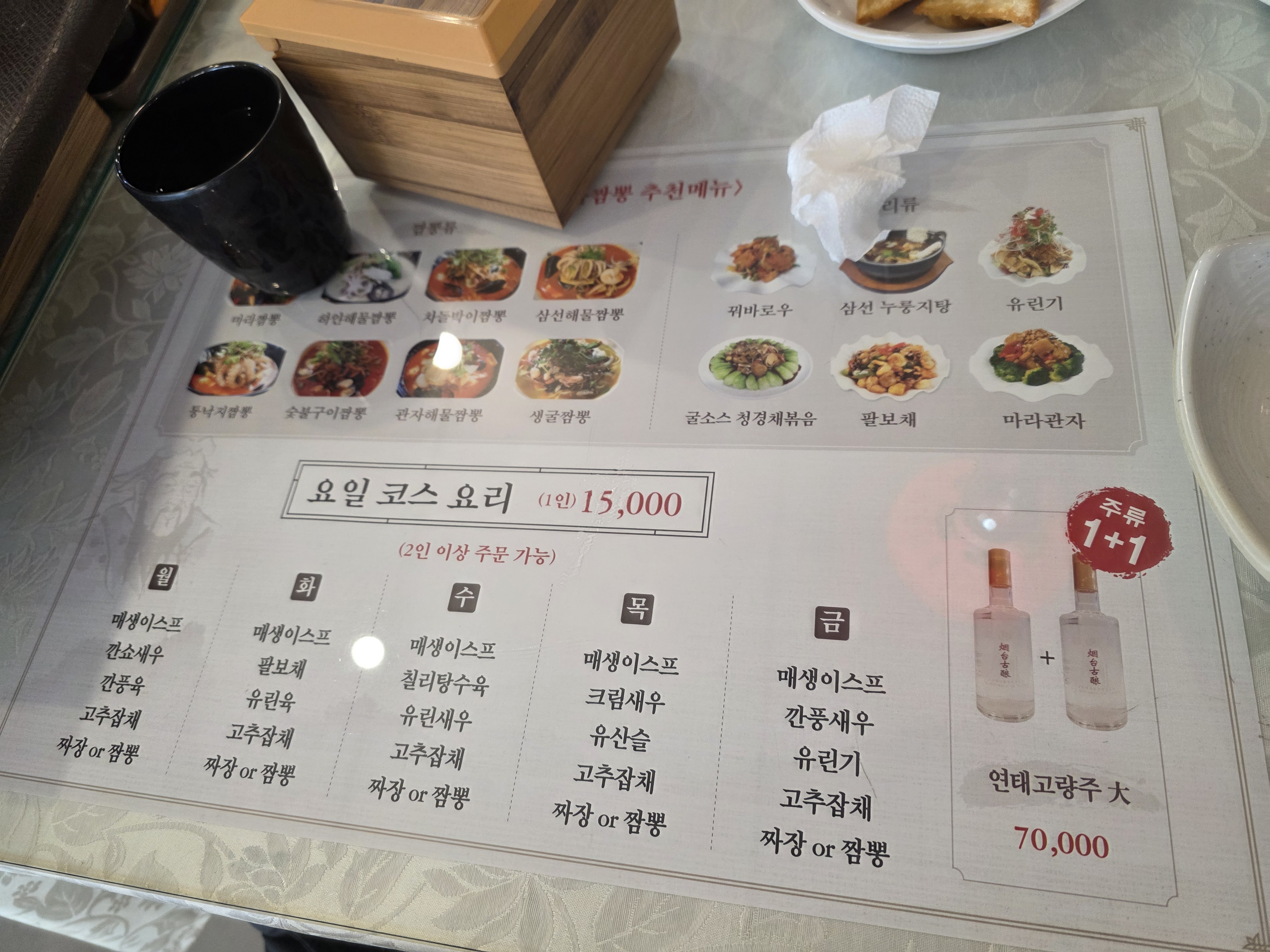 - 특이 사항: 주류 1+1 이벤트 진행 중 (연태고량주 大 70,000원)