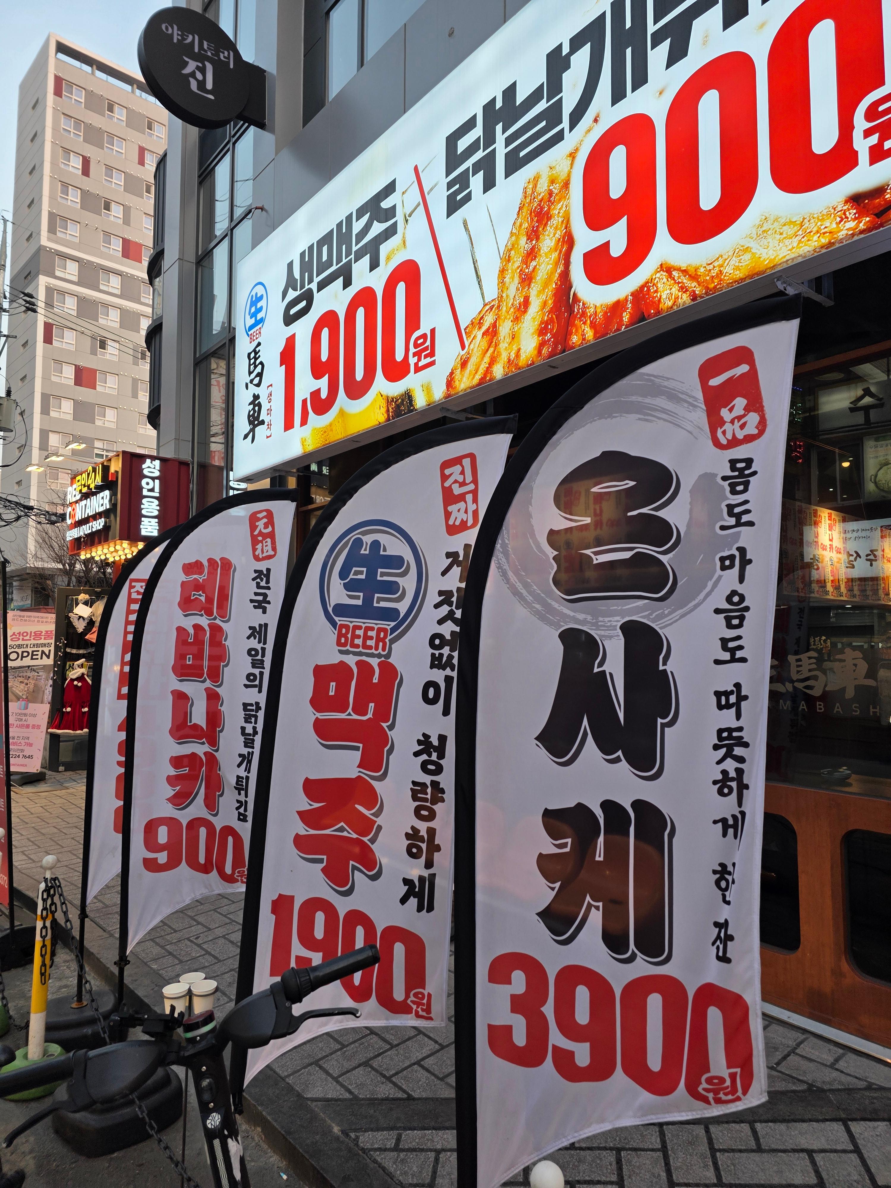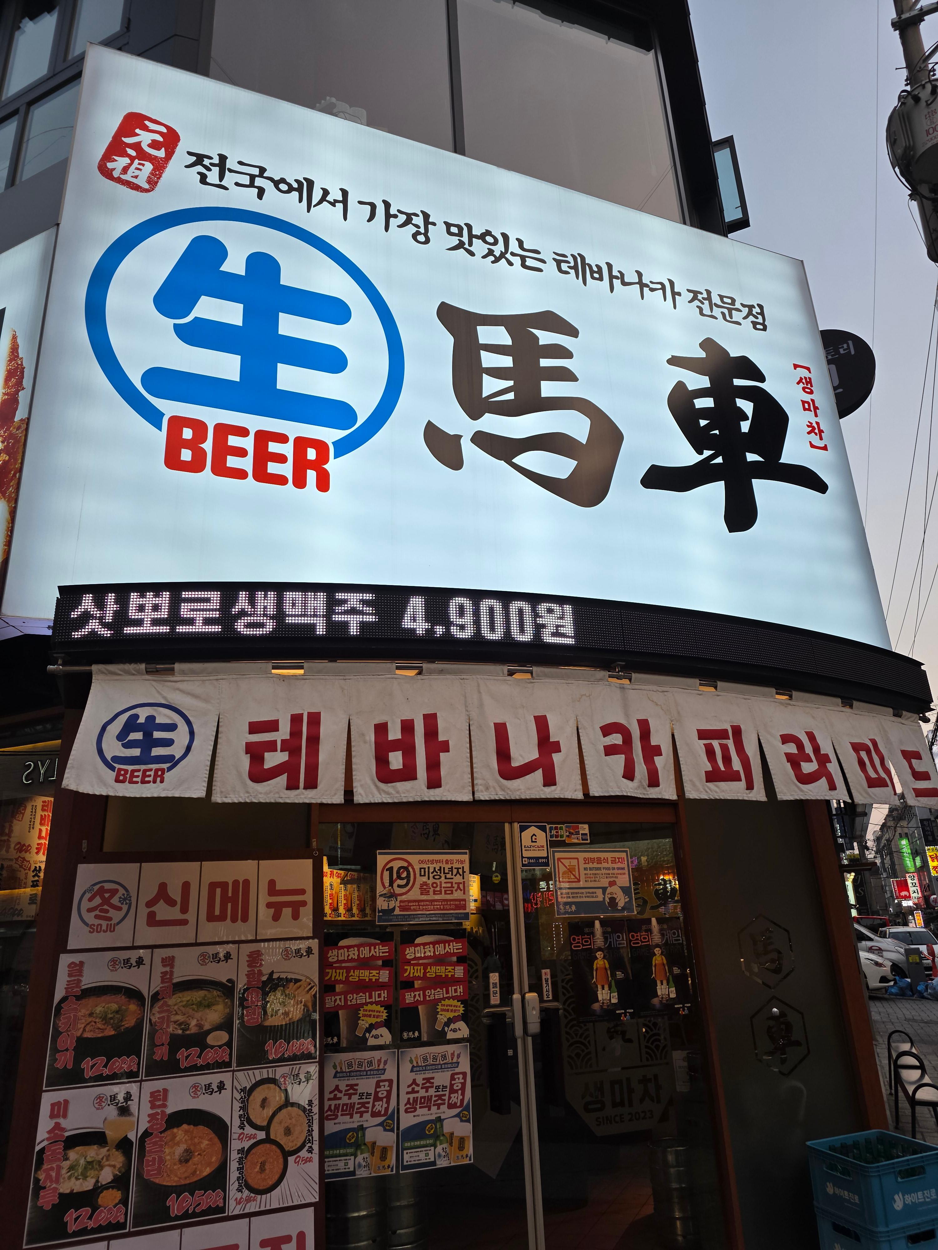 - 찾기 쉬움: 가게 앞을 지나가는 누구라도 시선을 사로잡는 '생맥주 1,900원'이라는 커다란 문구가 인상적입니다.