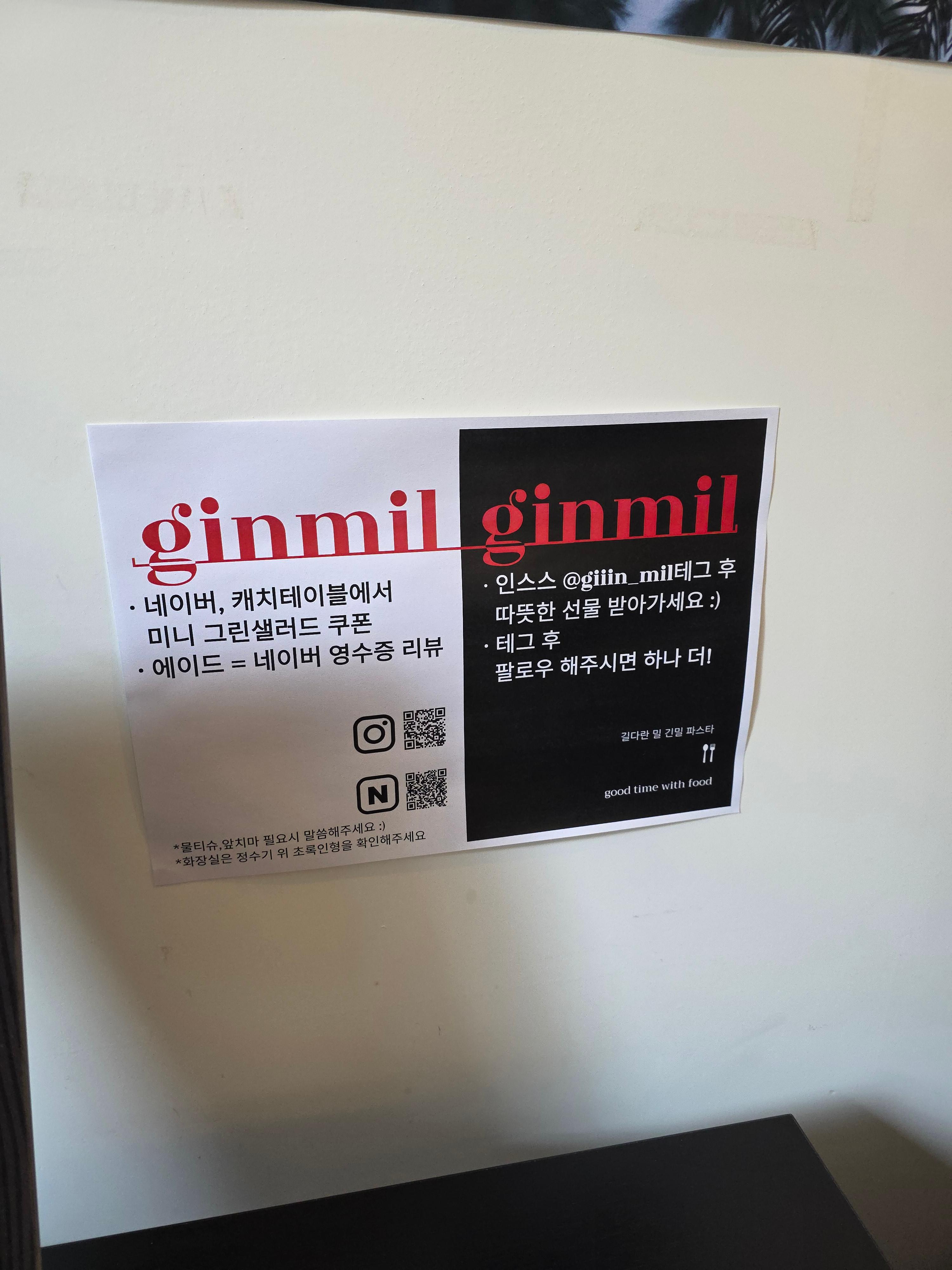 - 포장: 집에서도 '긴밀'의 맛있는 파스타를 즐길 수 있습니다.