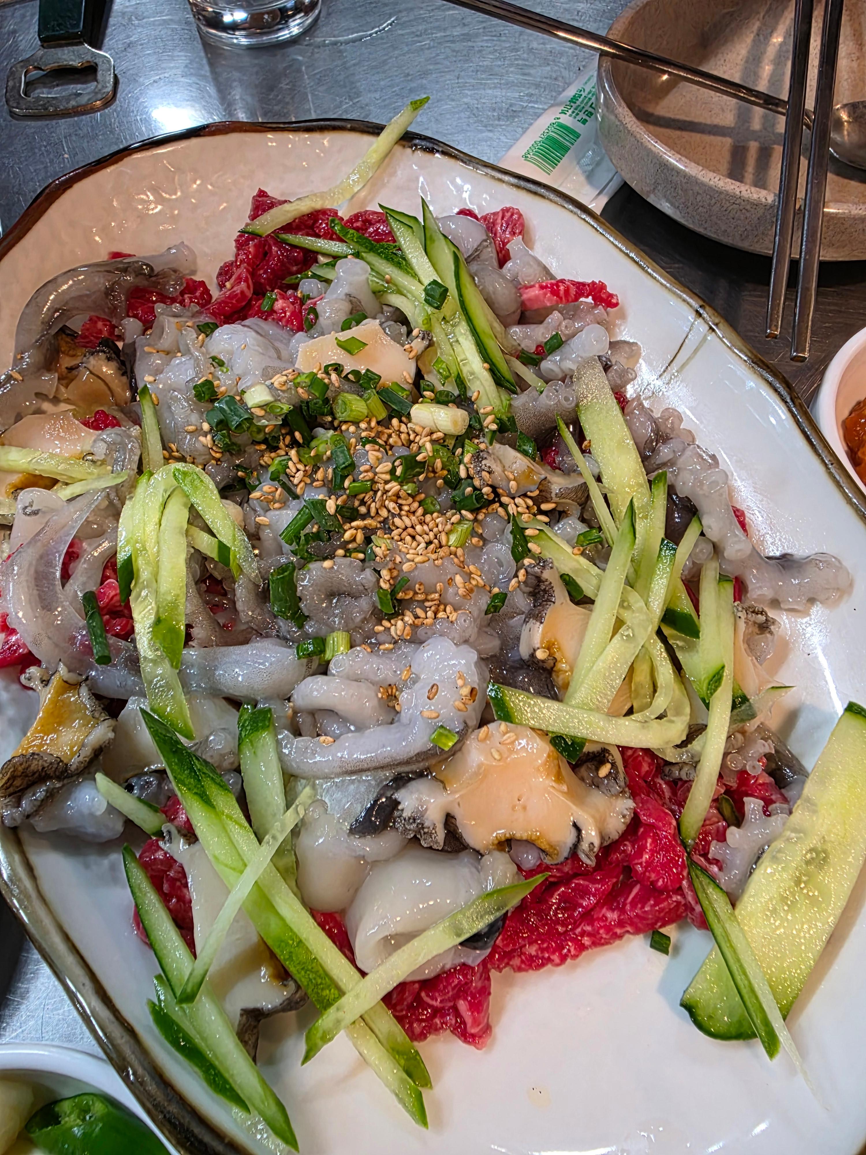 💡 추천 포인트: 한우육회와 해산물을 한 번에 즐길 수 있는 고급스러운 조합으로, 술안주로도 아주 훌륭한 메뉴입니다. 싱싱한 해산물을 좋아한다면 만족할 만한 선택!