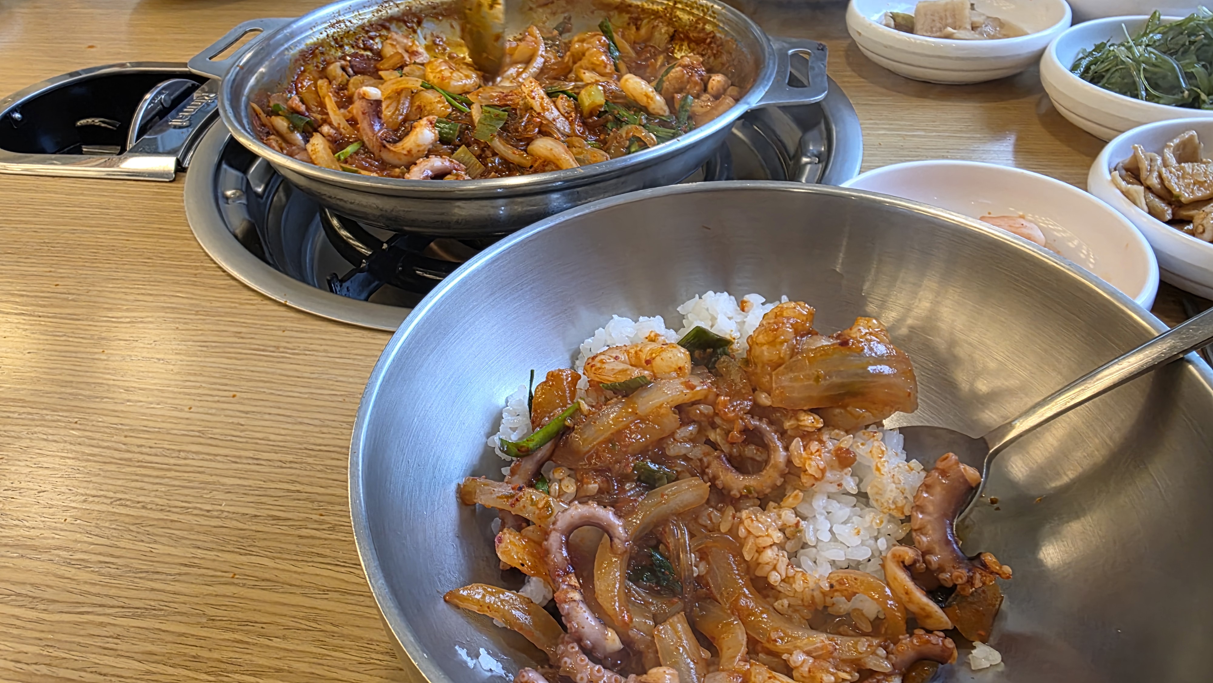 낙곱새는 이름 그대로 낙지 + 곱창 + 새우의 조합인데, 재료 하나하나가 신선하고 맛있게 양념되어 있었어요. 낙지는 탱글하고 곱창은 고소하며, 새우는 씹는 맛이 살아있더군요. 국물도 너무 자극적이지 않고 깊은 맛이 나서 공기밥에 비벼먹으면 정말 최고였어요.