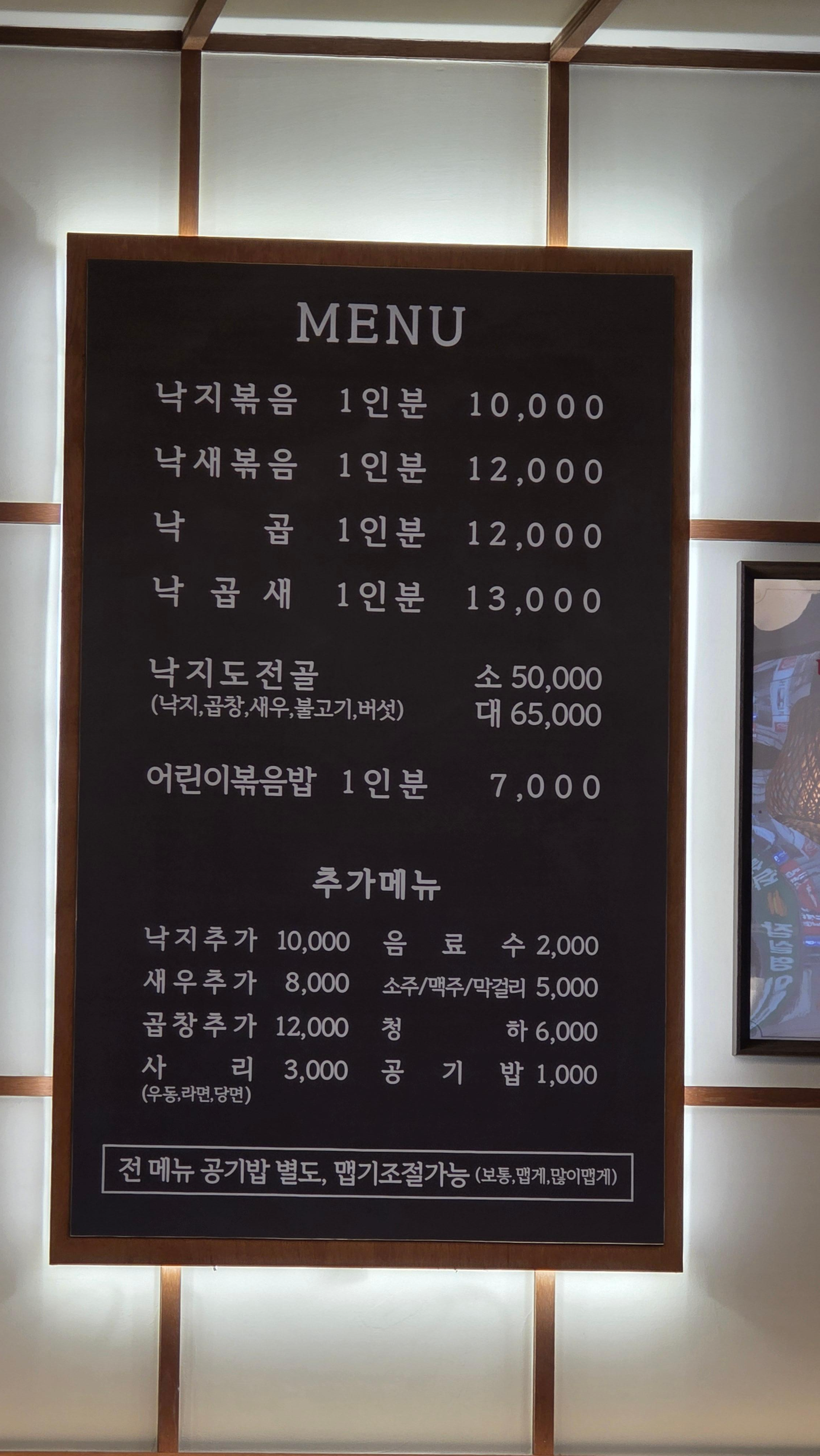 | 낙지도전골 | 50,000원 | 전골류, 낙지+곱창+소불고기 등 푸짐한 구성 |