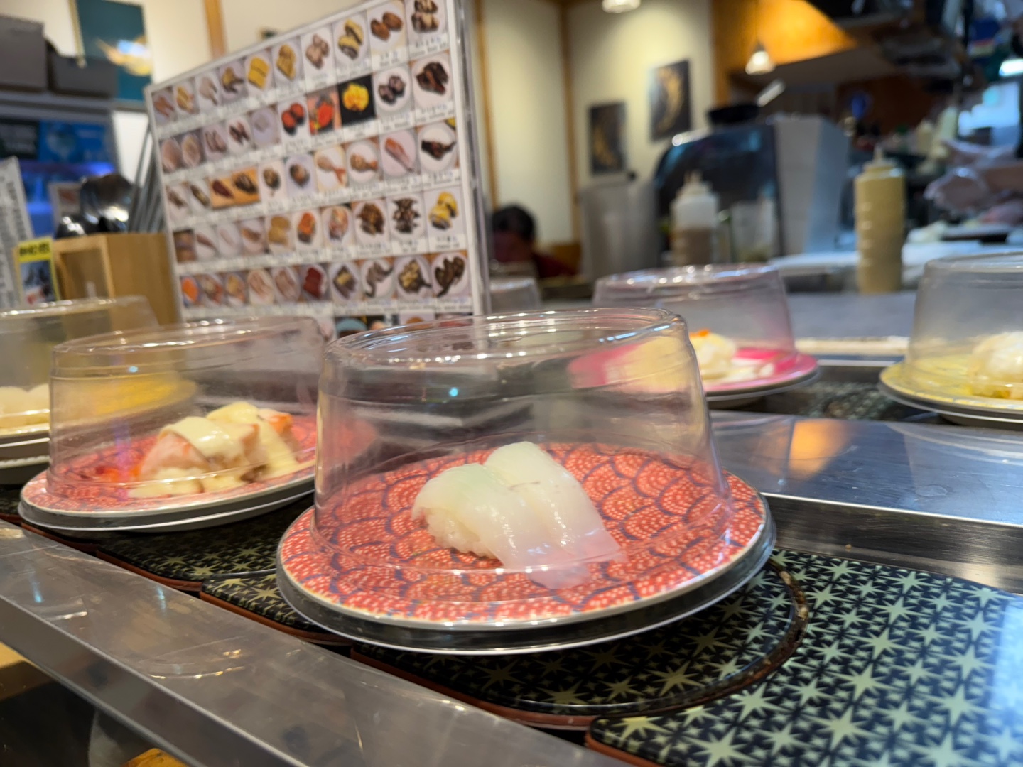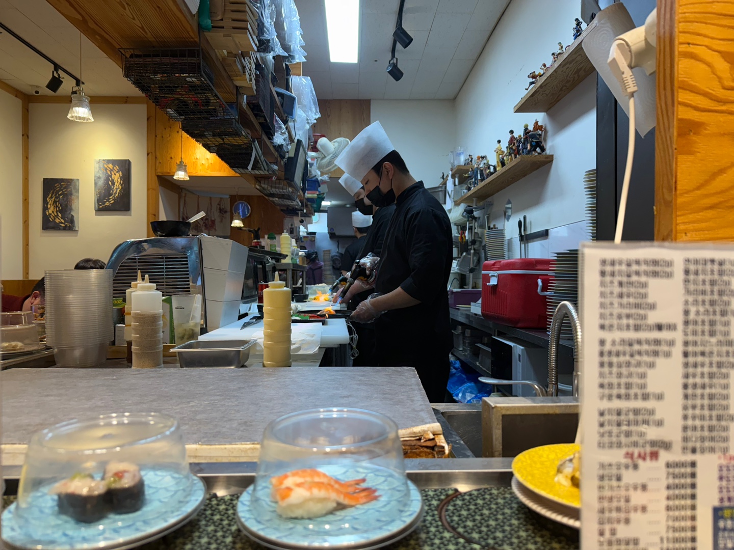 내부는 적당한 크기의 회전초밥 매장으로, 혼자 오신 분들도 여럿 계셔서 부담 없이 식사할 수 있습니다. 레일에 원하는 메뉴가 없을 경우에는 직원에게 요청하면 금방 만들어주는 시스템 덕분에 식사 흐름이 끊기지 않고 좋았습니다.