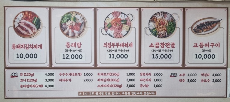 - 동태탕 (동태+고니+알): 12,000원